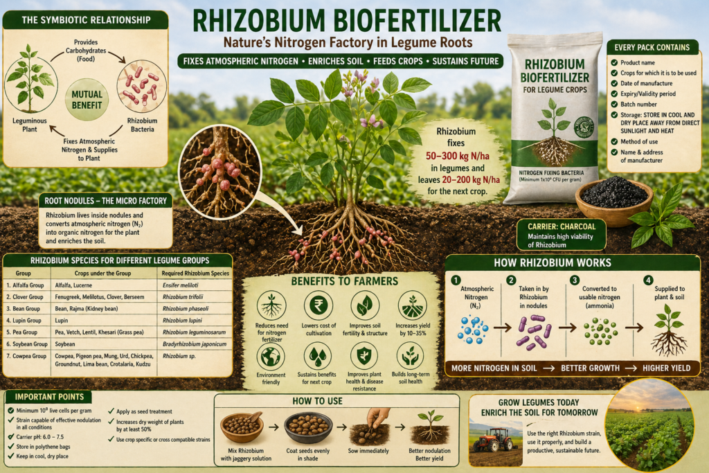 The use of Rhizobium biofertilizer is one of the most eco-friendly and cost-effective methods in modern sustainable agriculture. It not only meets the nitrogen requirement of the current leguminous crop but also leaves a residual benefit for following non-legume crops. This symbiotic nitrogen fixation process is highly efficient because it occurs directly at the root zone where the plant needs it most.