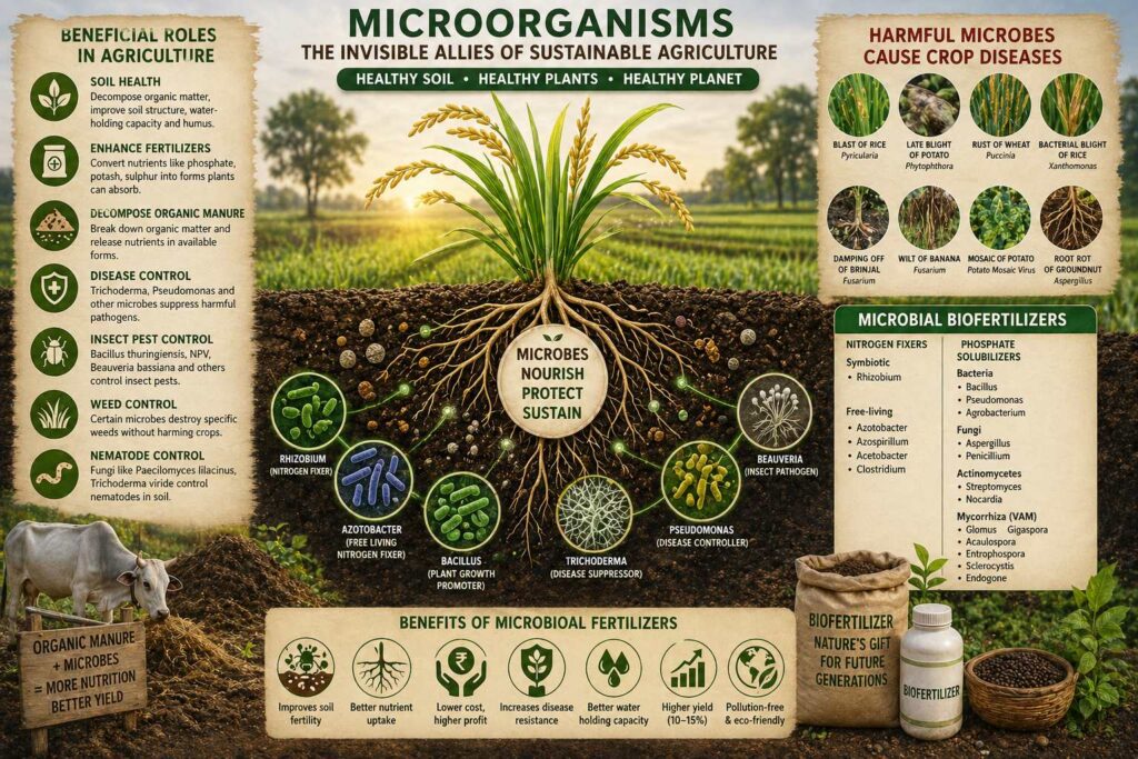 Several species of fungi such as Macrophomina, Pythium, Phytophthora, Rhizoctonia, and Colletotrichum; certain species of bacteria belonging to Pseudomonas and Xanthomonas; and viruses like Yellow Vein Mosaic Virus, Leaf Curl Virus, and Tungro Virus cause damage to crops. It is essential to understand the behavior of these harmful microorganisms and to control them effectively by using beneficial microorganisms—much like removing a thorn with another thorn—in a proper and targeted manner.