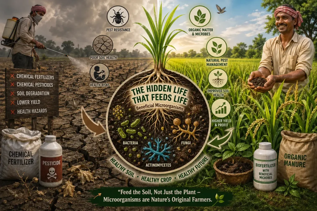 Microorganisms or microbes are the tiniest microscopic living beings that inhabit nature. They influence the nutrition and growth of living organisms both directly and indirectly. While most microorganisms are beneficial, some play harmful roles. Microorganisms are the oldest form of life on Earth. They exist in countless numbers mixed with water, soil, and dust particles in the air—including bacteria, fungi, viruses, mycoplasma, actinomycetes, and others. These innumerable microorganisms are directly and indirectly involved in the processes of creation, sustenance, and destruction. In the field of agriculture, their role is the broadest and most extensive.